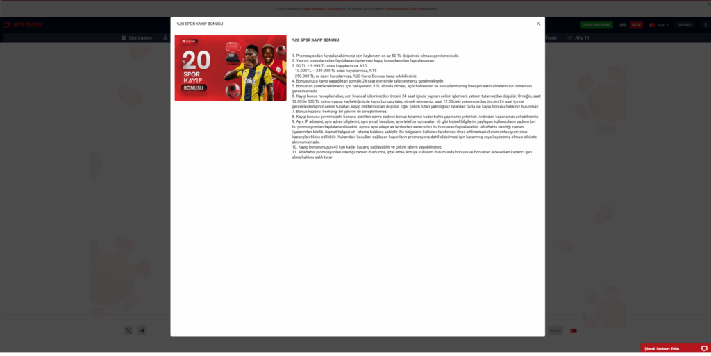Canlı casino ve şans oyunları üzerinden bahis oynayarak para kazanan bahis severlere büyük bir duyurumuz var! Artık Alfabahis üzerinden spor bahisleri ile kayıp yaşamanız halinde kayıp bonusu talep ederek kaybınıza oranla kayıp bonusu kazanabileceksiniz. Kayıp bonuslarınız sayesinde yeni bir şans elde ederek kazançlarınızı toplama fırsatı sunuyoruz. Spor bahis severler artık belirtilen bonus sayesinde kayıplarını kazanca dönüştürme imkanı bulabilecekler. Alfabahis spor kayıp bonusu dışında tüm bonus ve promosyonlara Alfabahis internet sitesi üzerinden erişim sağlayarak göz atabilir ve detayları inceleyebilirsiniz. Katılım şartları ve kurallar ile ilgili bir soru işareti olması durumunda 7/24 online destek ekibimizden yardım alabilirsiniz.
